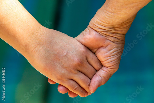 Hand in Hand, Daughter holding hand of her mother on bokeh blue swimming pool background, Asian body skin part, Symbol, Gesturing, Asian Body Language, Relationship wtih love concept