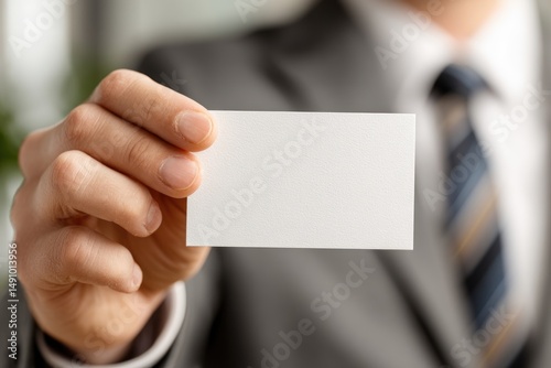 Hand in suit holding a blank white business card in a blurred setting.