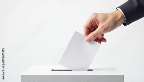 Hand inserting ballot into ballot box, white background , clean, civic duty