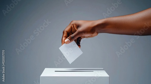 Hand Inserting Ballot Into Voting Box in a Studio Setting with Gray Background Emphasizing Democratic Process and Civic Engagement in Elections
