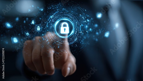 Hand interacting with a digital lock interface. A person's finger touches a glowing, holographic lock symbol, surrounded by data and digital elements. Focus on the interaction