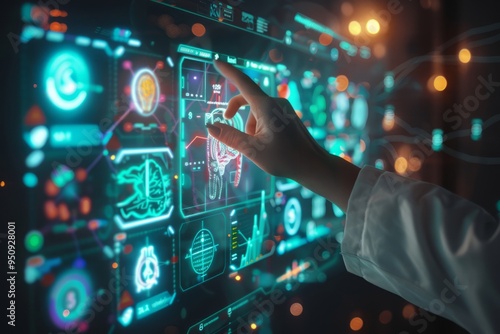 Hand interacting with a futuristic digital interface, symbolizing the power of technology, data analysis, and the interactive nature of modern digital systems in shaping the future.