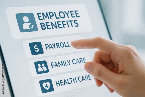 Hand Interacting with Digital Employee Benefits Interface Featuring Payroll, Family Care, and Health Care Options