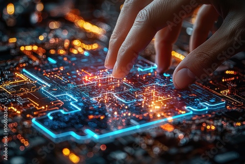 Hand Interacting with Glowing Circuit Board