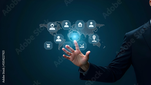 Hand Interacting with Holographic E-Learning Interface Showcasing Global Education Resources Icons