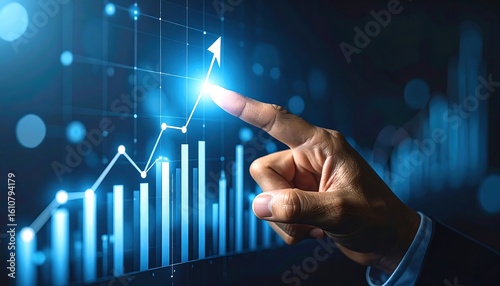 Hand interacts with a glowing upward trending graph displayed on a dark background