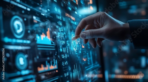 Hand interacts with futuristic digital data interface analysis technology