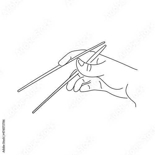 Hand is holding chopsticks, line art illustration. Black sketch on white background.
