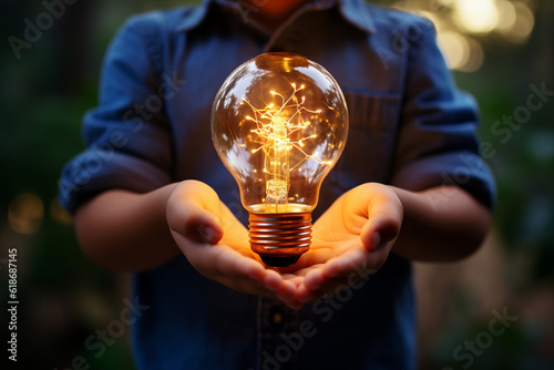 Hand kids holding glowing light bulb against nature. Alternative energy, idea, saving electricity innovation and inspiration concept. Generative AI.