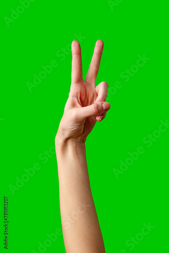 Hand Making Peace Sign Gesture Against Vibrant Green Background