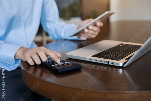Hand male doing finances and calculate on desk about cost at home office.