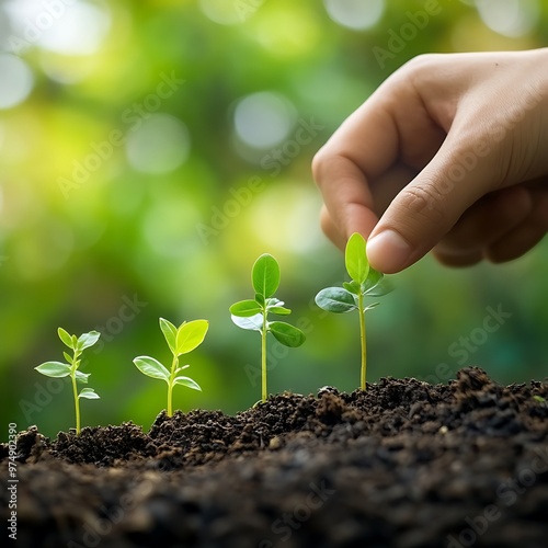 Hand nurturing a row of growing saplings in the soil. Concept of growth, sustainability, and environmental care.
