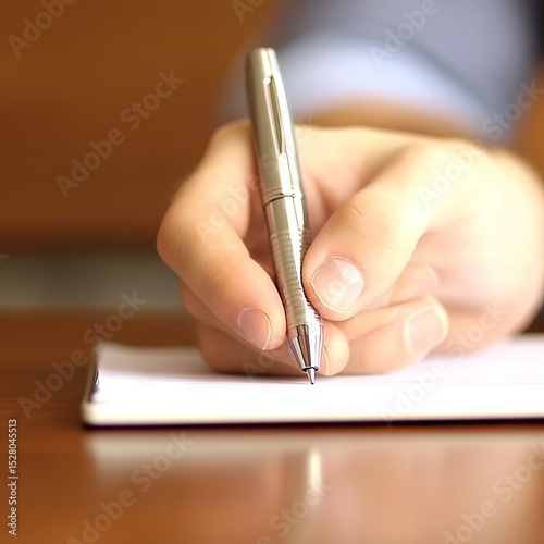 Hand of a business professional holding a silver pen poised over a blank notepad on a wooden desk, symbolizing productivity and creativity in a professional setting
