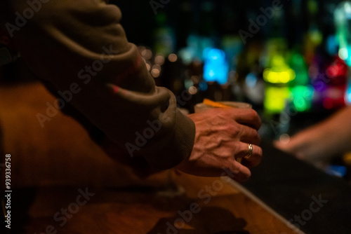 Hand of a married man. Holding a cocktail glass in a bar. Colourful background with bokeh. Customer experience.
