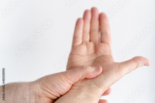 Hand of an elderly person with age spots doing thumb extension exercises while the other hand holds the wrist.