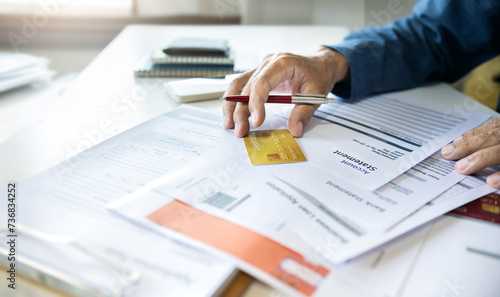 Hand of businessman holding credit card to checking account statement after spending to purchase order. Online shopping concept