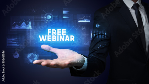 Hand of Businessman holding FREE WEBINAR inscription, business success concept