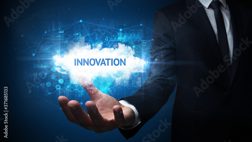 Hand of Businessman holding INNOVATION inscription, successful business concept