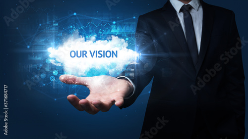 Hand of Businessman holding OUR VISION inscription, successful business concept