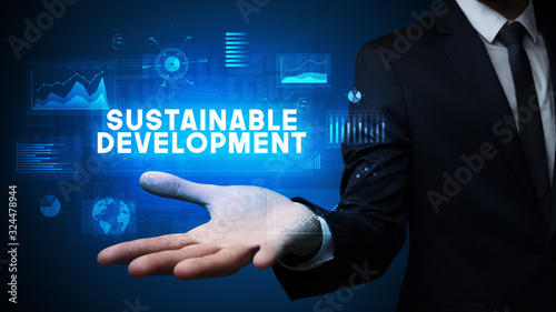 Hand of Businessman holding SUSTAINABLE DEVELOPMENT inscription, business success concept