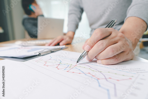 Hand of businessman point to graph. is discussing together in conference room talk about Report, Sales, Target, Marketing,