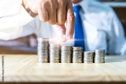 Hand of businessman stack coins on wooden table. Shown concept of growing business and wealthy for finance accounting.
