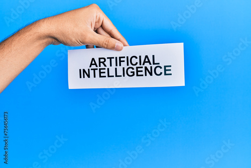 Hand of caucasian man holding paper with artificial intelligence message over isolated blue background