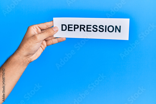 Hand of caucasian man holding paper with depression word over isolated blue background