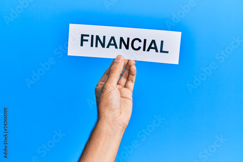 Hand of caucasian man holding paper with financial word over isolated blue background