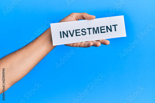 Hand of caucasian man holding paper with investment word over isolated blue background