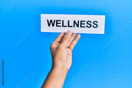 Hand of caucasian man holding paper with wellness word over isolated blue background