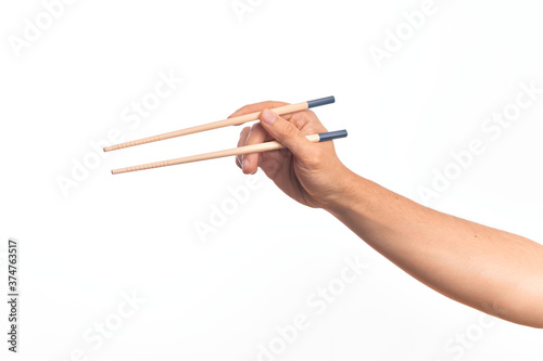 Hand of caucasian young man holding chopsticks over isolated white background
