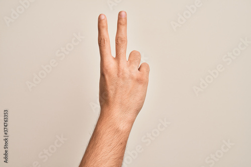 Hand of caucasian young man showing fingers over isolated white background counting number 2 showing two fingers, gesturing victory and winner symbol