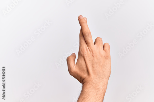 Hand of caucasian young man showing fingers over isolated white background gesturing fingers crossed, superstition and lucky gesture, lucky and hope expression