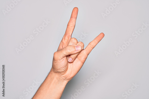 Hand of caucasian young man showing fingers over isolated white background gesturing rock and roll symbol, showing obscene horns gesture