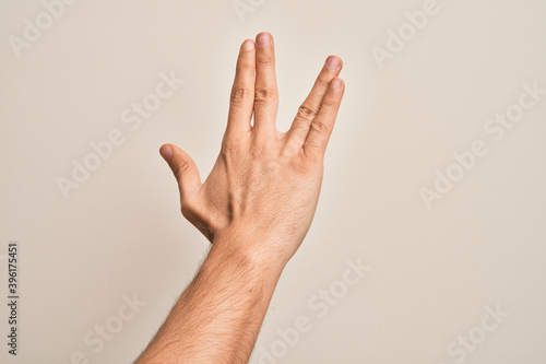 Hand of caucasian young man showing fingers over isolated white background greeting doing Vulcan salute, showing back of the hand and fingers, freak culture