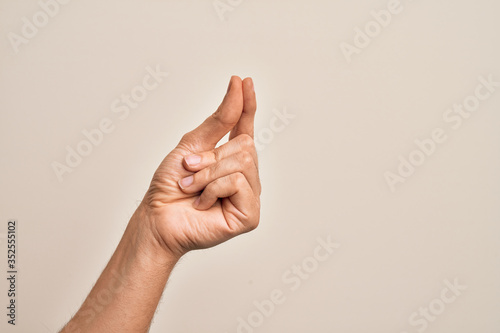 Hand of caucasian young man showing fingers over isolated white background holding blank space with thumb finger, business and advertising