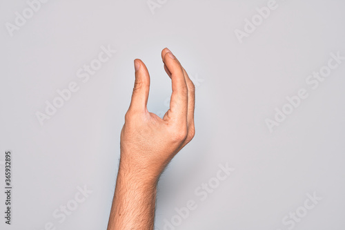 Hand of caucasian young man showing fingers over isolated white background picking and taking invisible thing, holding object with fingers showing space