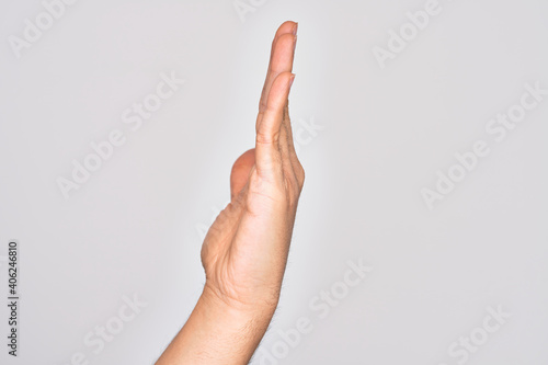 Hand of caucasian young man showing fingers over isolated white background showing side of stretched hand, pushing and doing stop gesture