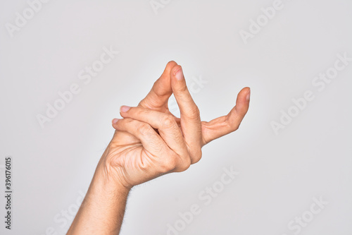Hand of caucasian young man showing fingers over isolated white background snapping fingers for success, easy and click symbol gesture with hand
