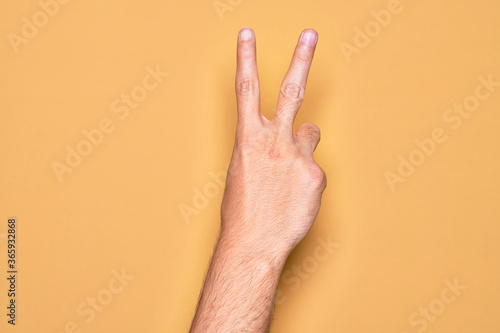 Hand of caucasian young man showing fingers over isolated yellow background counting number 2 showing two fingers, gesturing victory and winner symbol