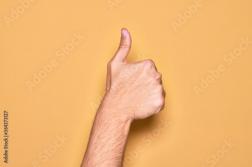 Hand of caucasian young man showing fingers over isolated yellow background doing successful approval gesture with thumbs up, validation and positive symbol