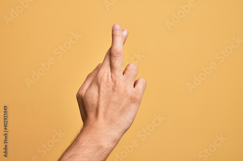 Hand of caucasian young man showing fingers over isolated yellow background gesturing fingers crossed, superstition and lucky gesture, lucky and hope expression