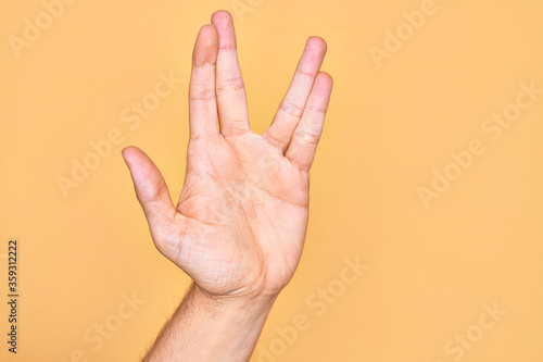 Hand of caucasian young man showing fingers over isolated yellow background greeting doing Vulcan salute, showing hand palm and fingers, freak culture