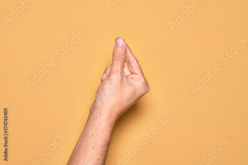 Hand of caucasian young man showing fingers over isolated yellow background holding blank space with thumb finger, business and advertising