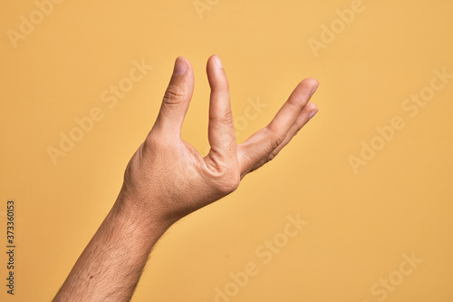 Hand of caucasian young man showing fingers over isolated yellow background picking and taking invisible thing, holding object with fingers showing space
