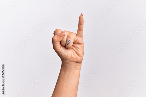 Hand of caucasian young woman showing little finger as pinky promise commitment, number one