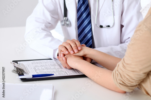 Hand of doctor reassuring her female patient. Medical ethics and trust concept