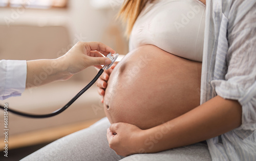 Hand of female gynecologist with stethoscope Use a stethoscope to listen to the baby in the womb or the heartbeat of a pregnant woman.
