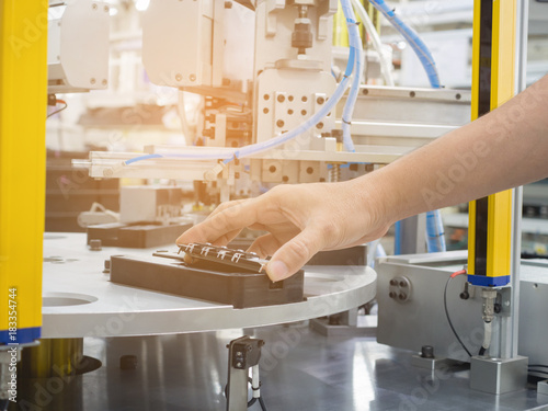 Hand of man insert electronic parts to socket of auto machine.
